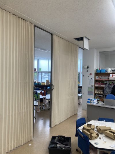 今回は初等学校にアコーデオンカーテンを取替えに行った時の様子です。既存のアコーデオンカーテンは他の業者さんが取付けして、1度天井から落ちてしまったとお聞きしました。重量も結構ありますので、下地の確認をしっかりと行い、ビスも通常の倍の数を使って、がっちり取付けさせて頂きました。