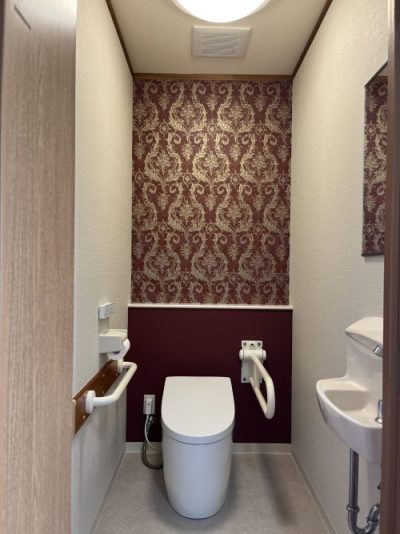 特別養護老人ホームのゲストルームトイレの内装工事を施工しました。お客様のご要望は高級感がある雰囲気にしたとのことでした。施設の女性スタッフの方々でクロスを選んで頂き、アクセントクロスを入れたデザインになりました。床は何か提案してほしいとの事でしたので、イメージしやすい様に模型を作り、2種類ご提案させて頂きました。とても豪華な感じになりました。