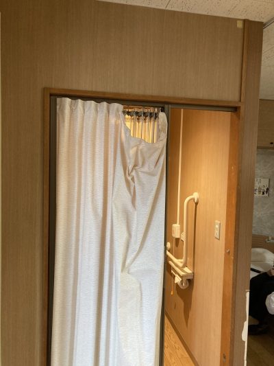 今回ご紹介するのは、アコーディオンカーテンの取り替え現場です。お取替え前のアコーディオンは、骨組みからビニール生地が外れた状態になっていました。新しいアコーディオンにお取替えした場合の見積りや厚めの遮光カーテンにお取替えした場合のお見積りなどいくつかのご提案させていただきました。いろいろご検討するなかで木質感あるパネルデザインのアコウォールに取替えが決まりました。アコウォールを採用した病院が静岡市内にあるとのことで、メーカー立ち合いのもと見学したうえで決定して頂きました。木製のパネルですので、空間に上質感と温もりが演出できました。パネルを開けた時のたたみしろも、今までのアコーディオンに比べて3分の1ぐらいになりますので、車椅子での出入りもしやすくなると思います。